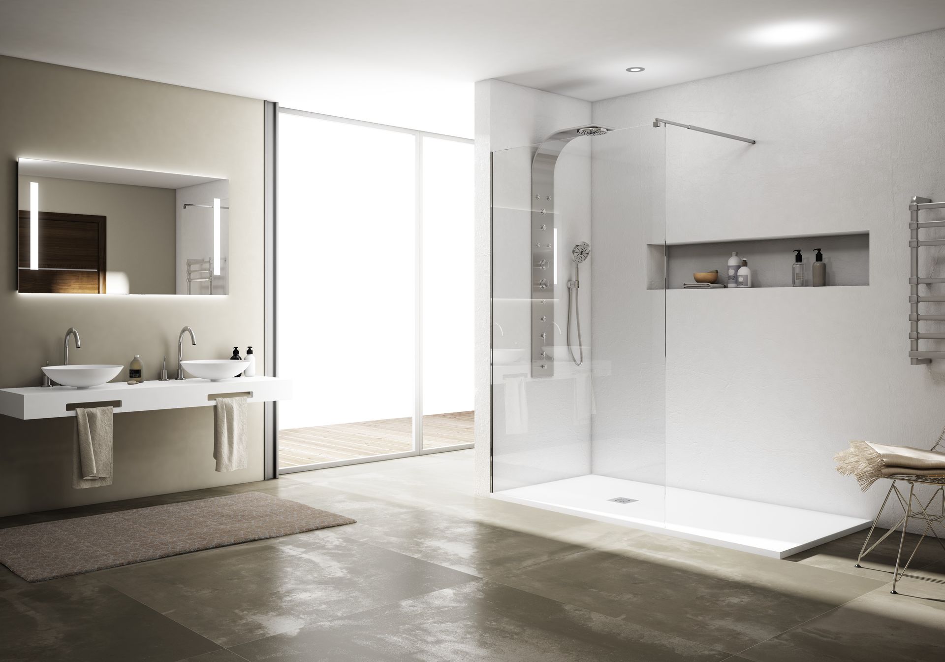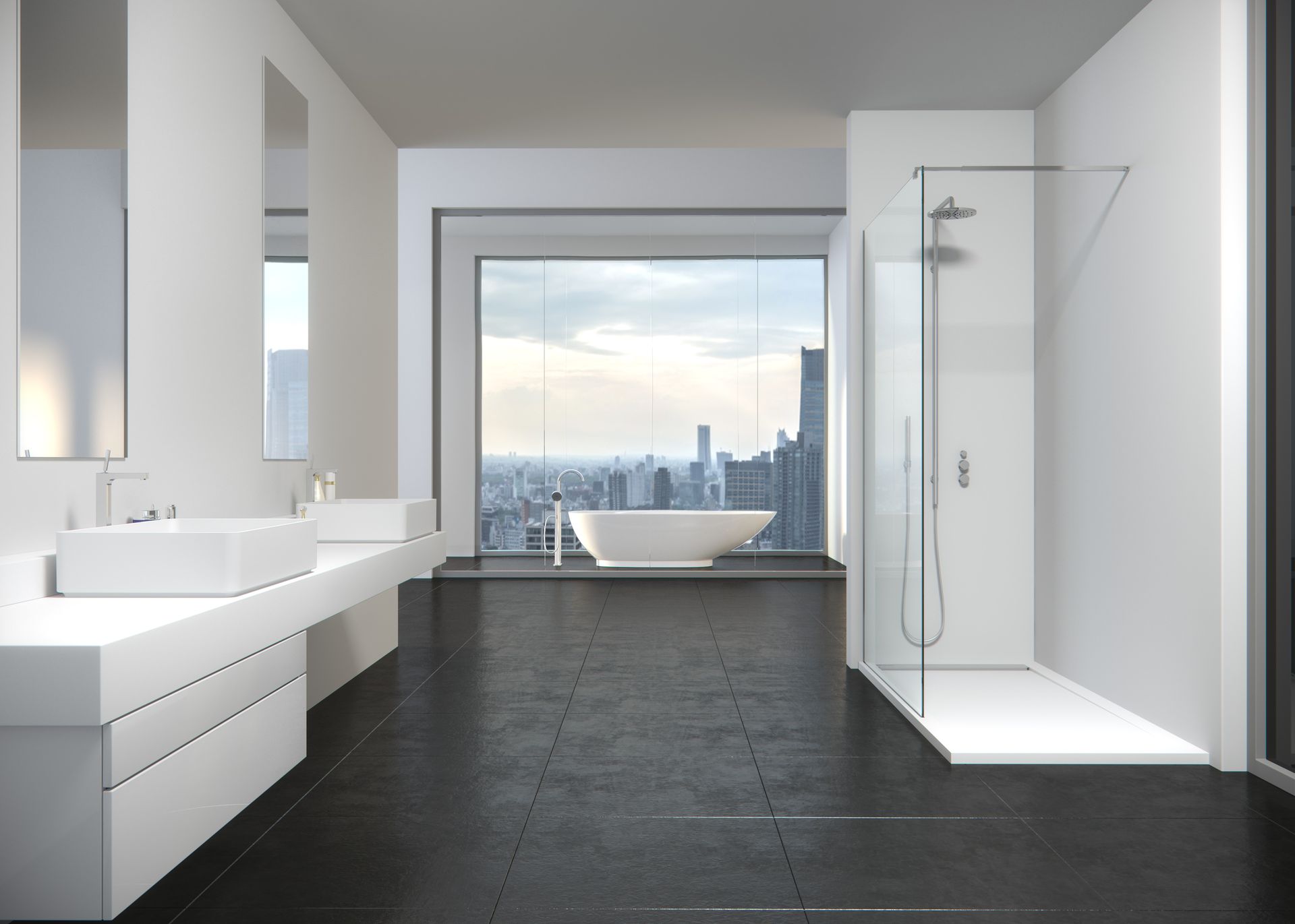 Estilo Moderno: se caracteriza por su estética sencilla, formas limpias y líneas rectas y colores neutros como el blanco, el gris o el negro (utilizando este último solamente para detalles, para no perder la sensación de amplitud). En este estilo las bañeras han quedado totalmente relegadas por los platos de ducha, ya que se busca la practicidad y la comodidad. Mamparas acristaladas, muebles suspendidos y grifería empotrada.