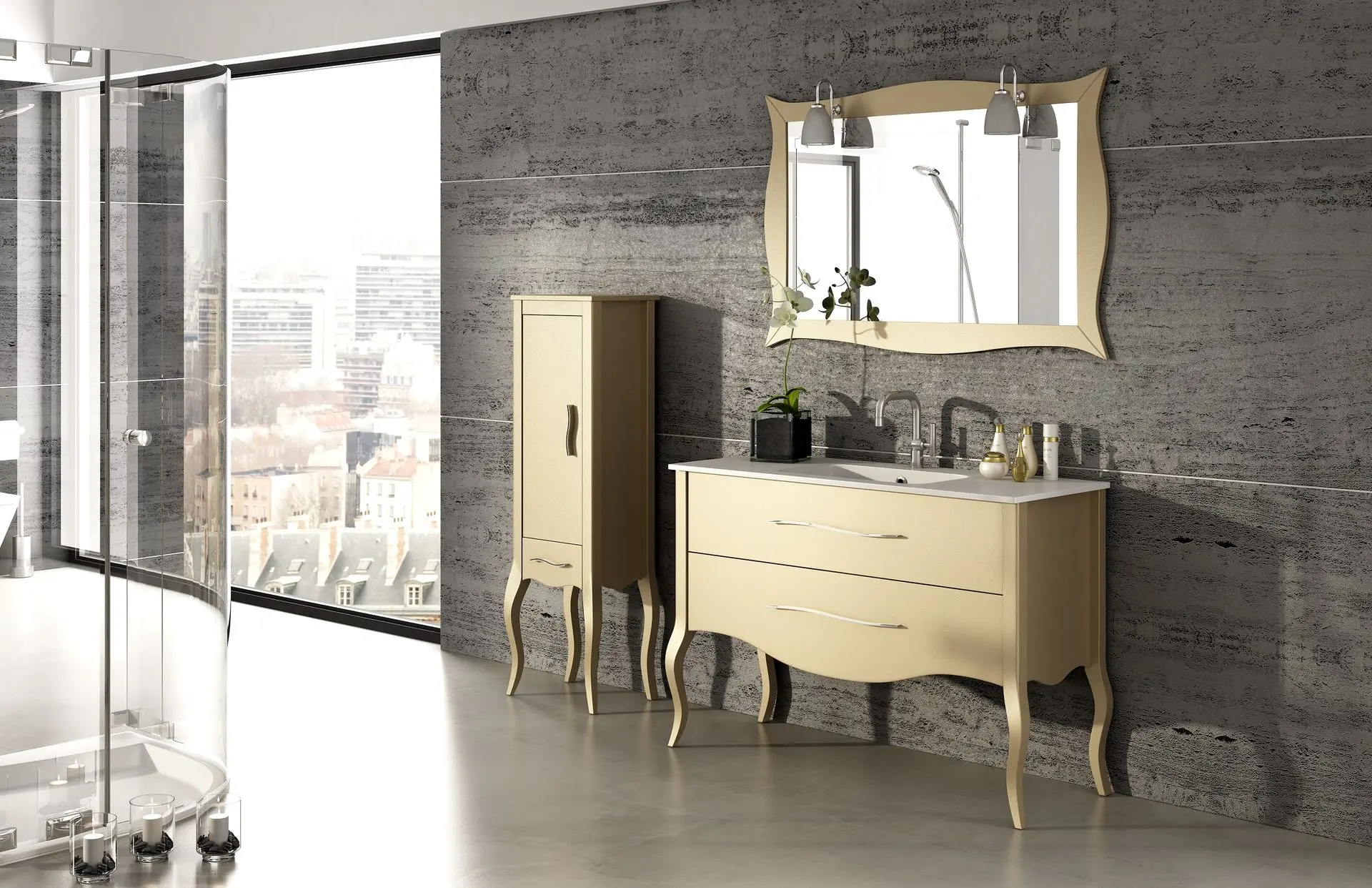 Estilo clásico: El mueble de estilo clásico, nunca pasa de moda, normalmente son de madera maciza y sus líneas y porte son más contundentes. Además, cumplen una doble como un espacio de almacenaje y una pieza decorativa en la estancia. Además, en este estilo, el mármol es la "estrella", usándose sobre todo en encimeras, lavabos o bañeras. Las paredes tienen mucha importancia y están diferenciadas en dos zonas, superior -más clara- e inferior -más oscura-.