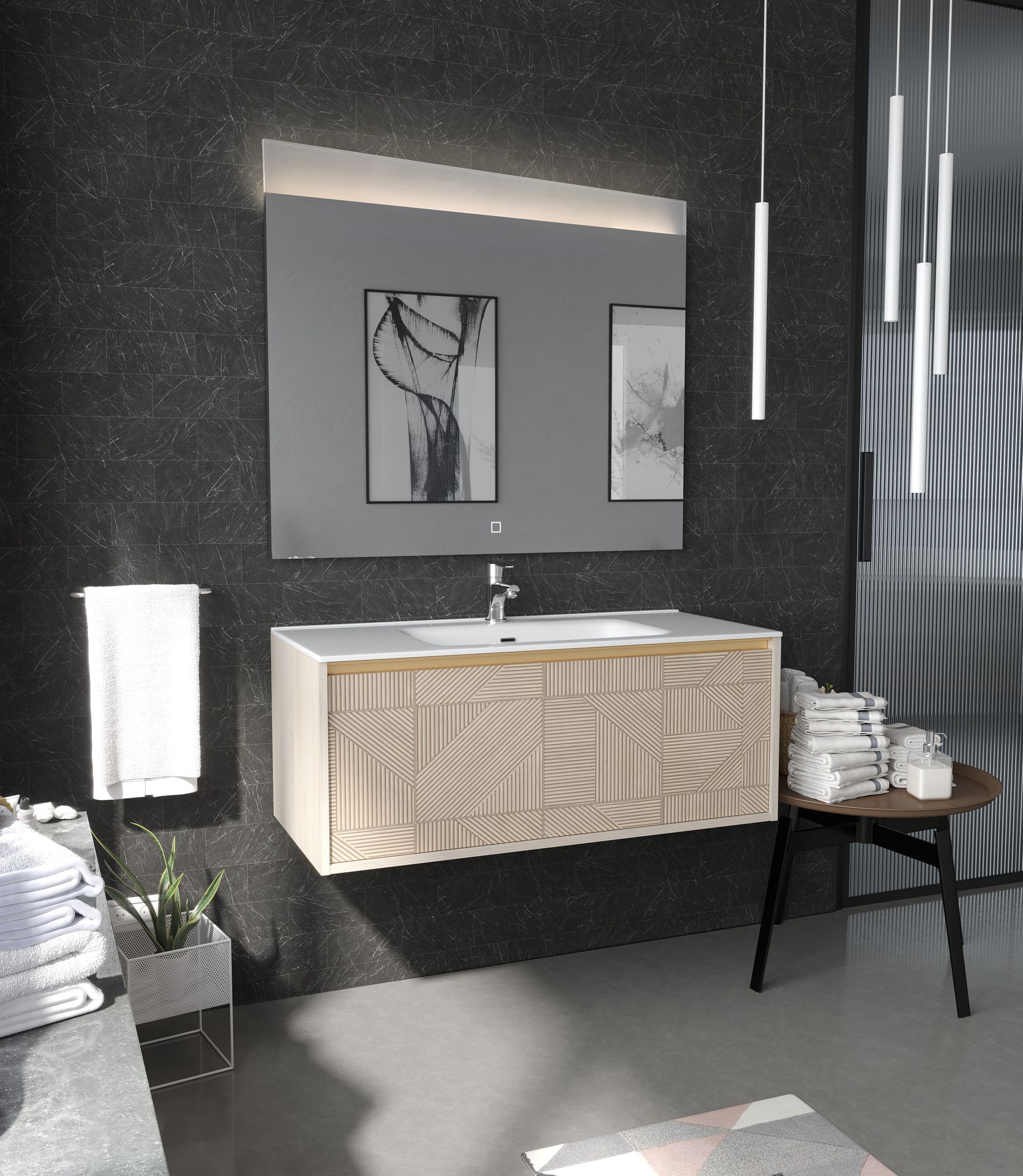 Se trata de un mueble suspendido con un cajón de gran capacidad, pensado para quienes buscan una solución visualmente ligera, práctica y con un acabado diferencial. Su diseño destaca por un frente estratégicamente enmarcado por los costados, creando una estética envolvente, equilibrada y sofisticada.