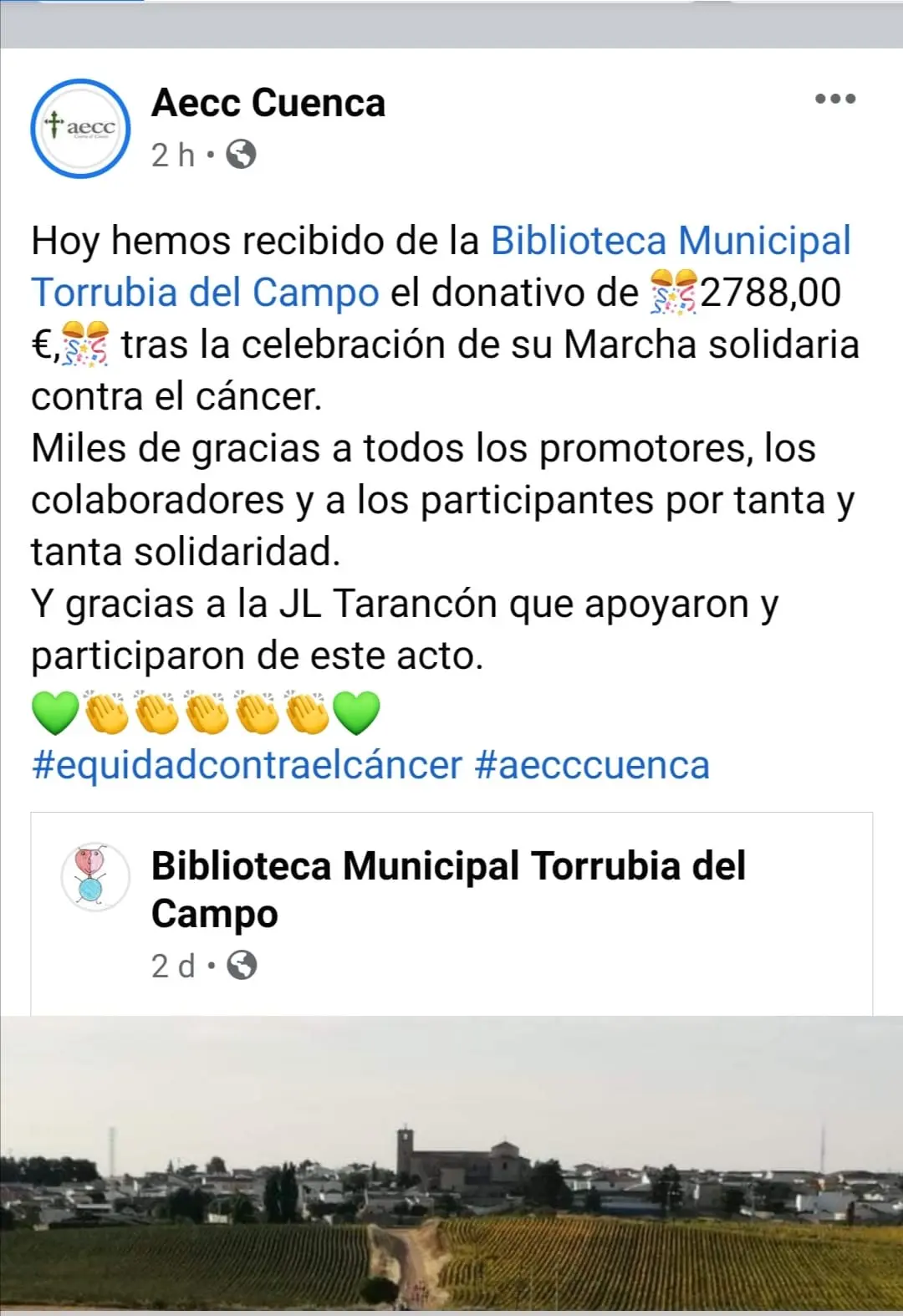Gracias a la gran participación de los vecinos se ha logrado recaudar 2788€ que irán destinados a la Asociación Contra el Cáncer de Cuenca.
