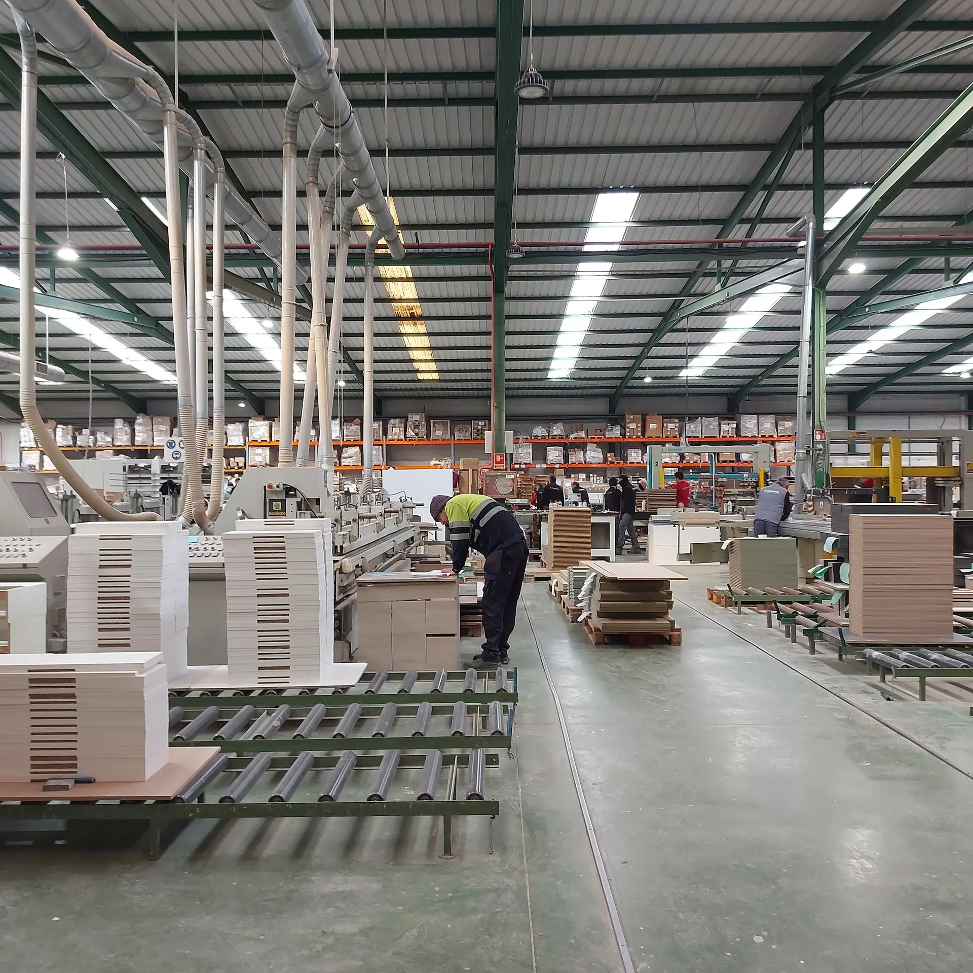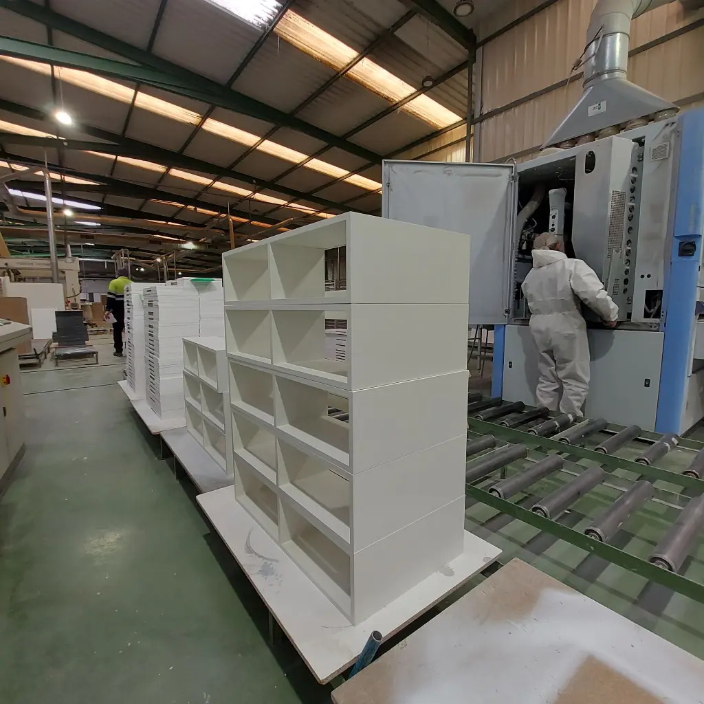 Una vez que el material ha sido cortado, canteado y mecanizado, pasa a la siguiente fase. En el caso de los muebles lacados, por lo general se utilizan tableros de partículas (aglomerado). Sin embargo, cuando los frentes llevan fresados o uñeros, estos se fabrican en MDF, manteniéndose el resto del mueble en tablero de partículas.