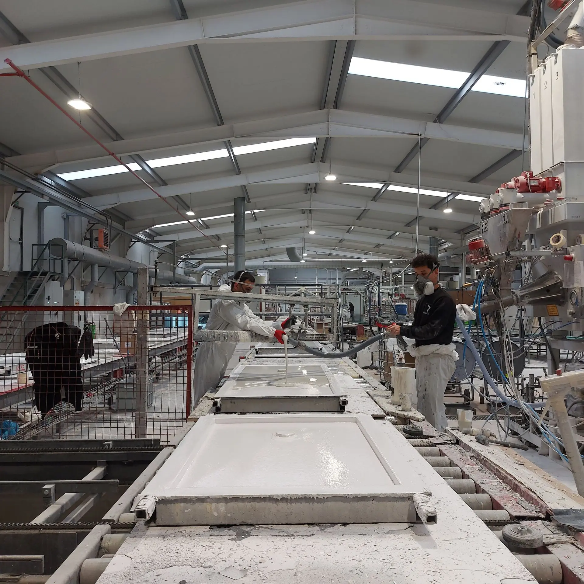 Con esta ampliación, la fábrica dispuso de un total de 13.500 metros cuadrados. Instalación de un sistema de fabricación de platos de ducha automatizado y continuo.